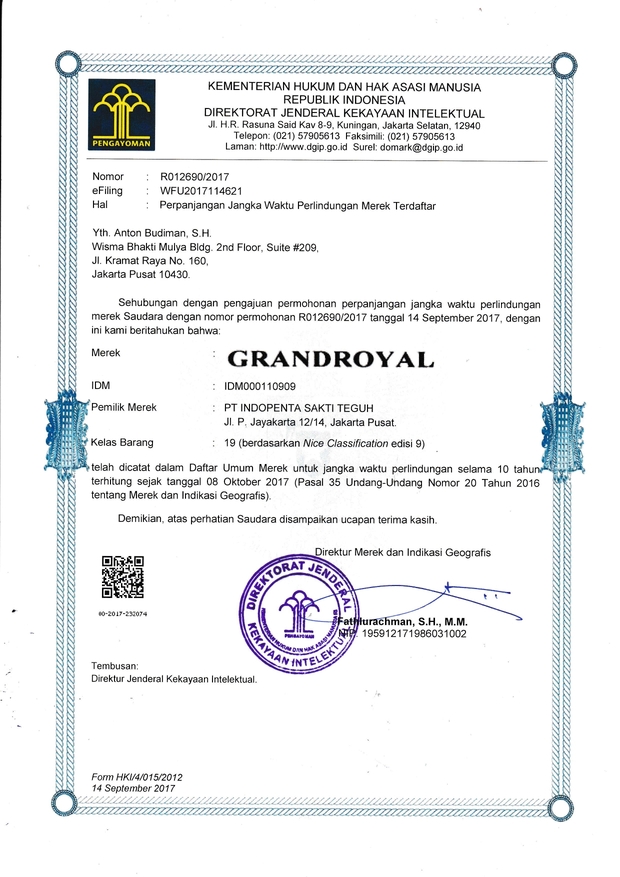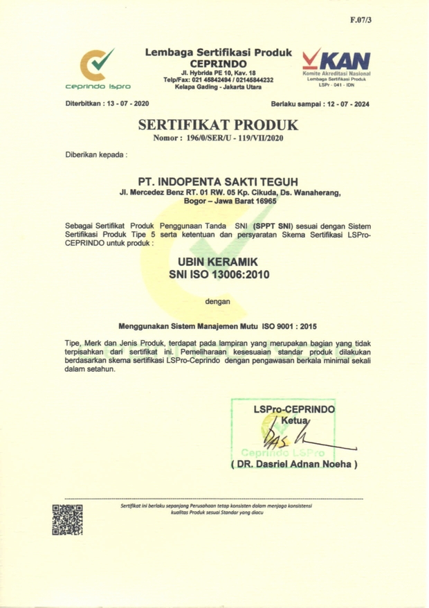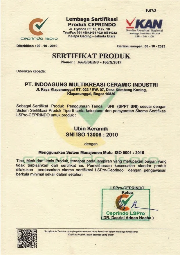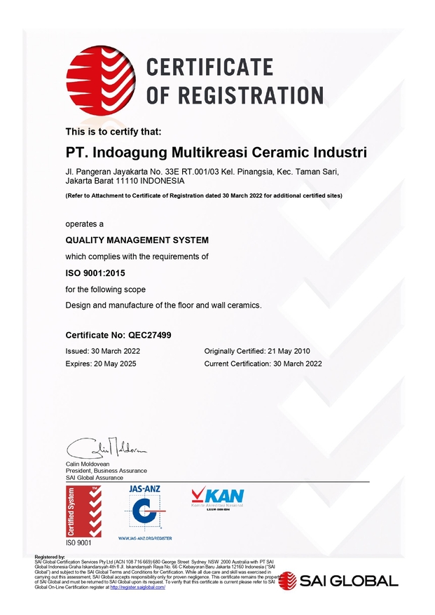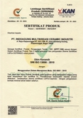 As an assurance of our quality and to guarantee customer satisfaction, Grandroyal ceramic is certified by ISO, SNI, and KEMENKUMHAM. As a brief reference - ISO certification is the international standardization for various products and services, SNI certification is for National/Indonesian, and KEMENKUMHAM is for Ministry of Law and Human Rights. As can be seen in this page we have consistently had our products certified by all three of them and will continue to do so in the future.